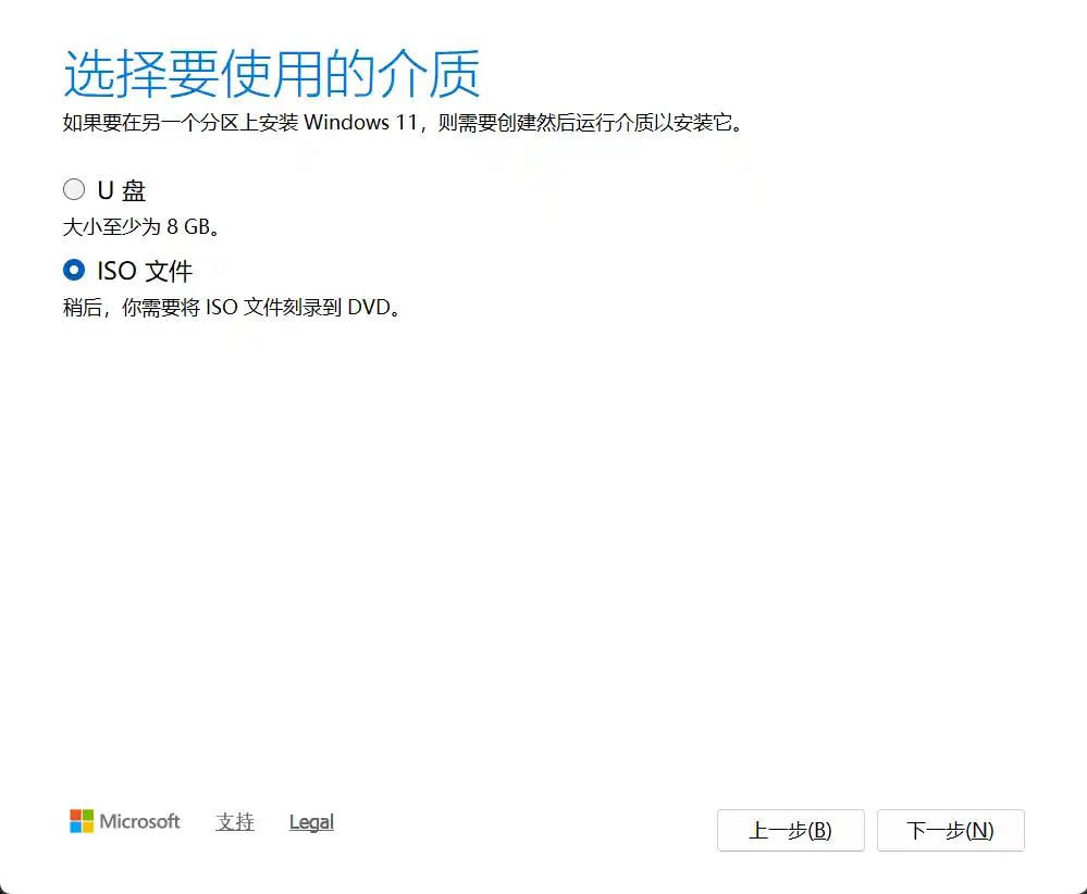 2.打开刚刚下载好的媒体创建工具一直选择下一步,直到下图这个界面,选择ISO文件,在点击下一步后选择ISO文件的保存位置。等待文件下载完毕。