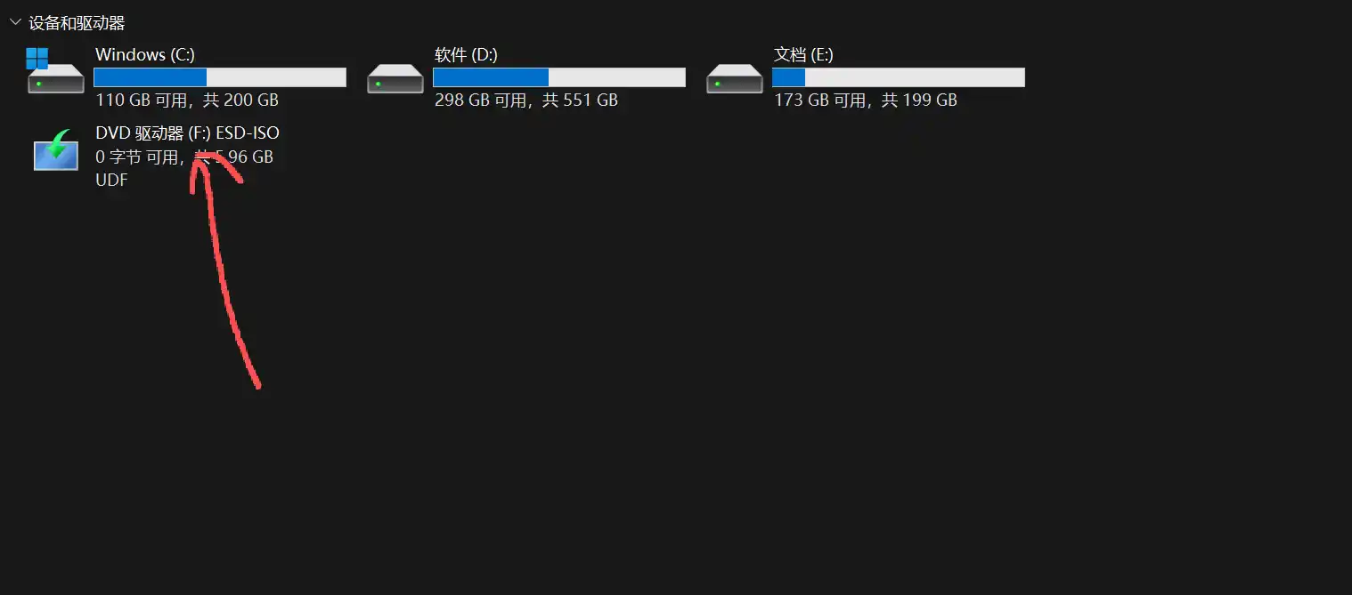 1.双击刚才下载好的ISO文件,ISO文件会自动挂载,记住挂载的盘符,如下图(图中的盘符为F:)