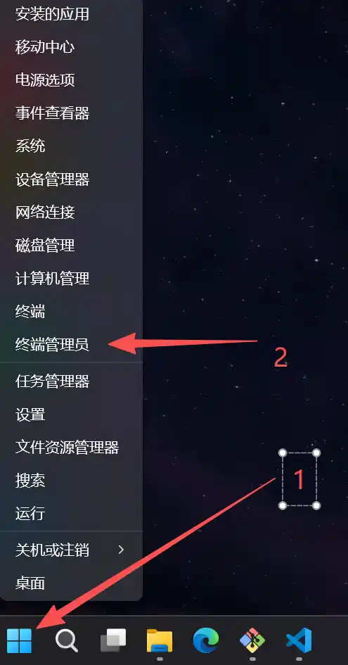 2.然后右键任务栏的Windows图标(或者使用快捷键win+x),选择终端管理员(有的可能显示的是powershell管理员)。