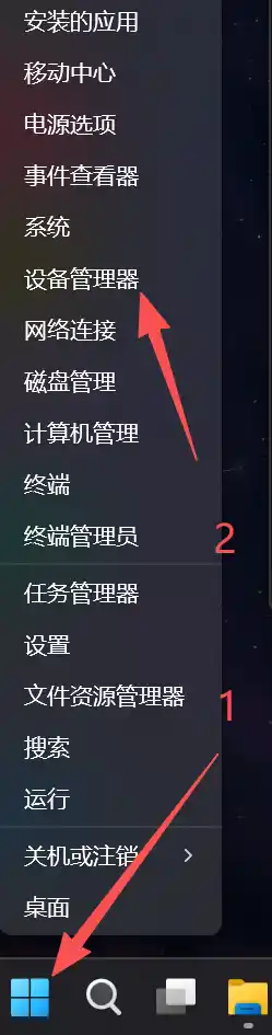 1.右键任务栏的Windows图标(或者使用快捷键win+x),然后从上下文菜单中选择设备管理器