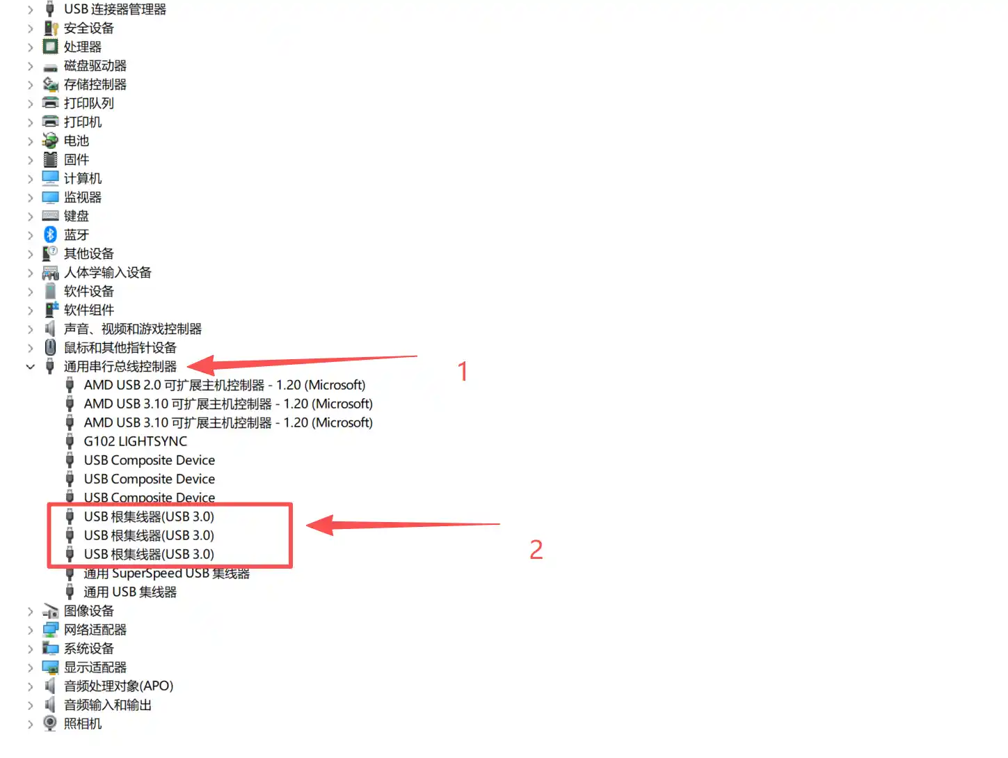 2.找到通用串行总线控制器并展开,再找到通用USB集线器或USB根集线器,右键然后选择属性。