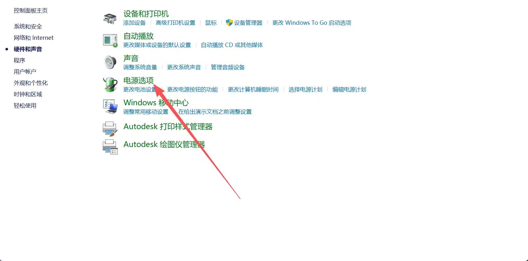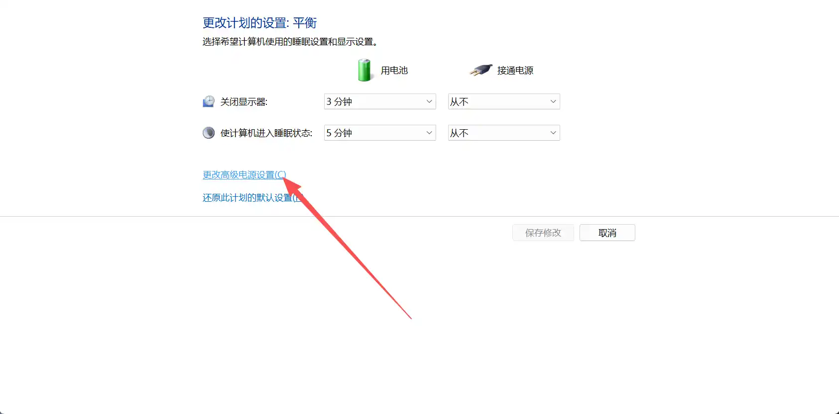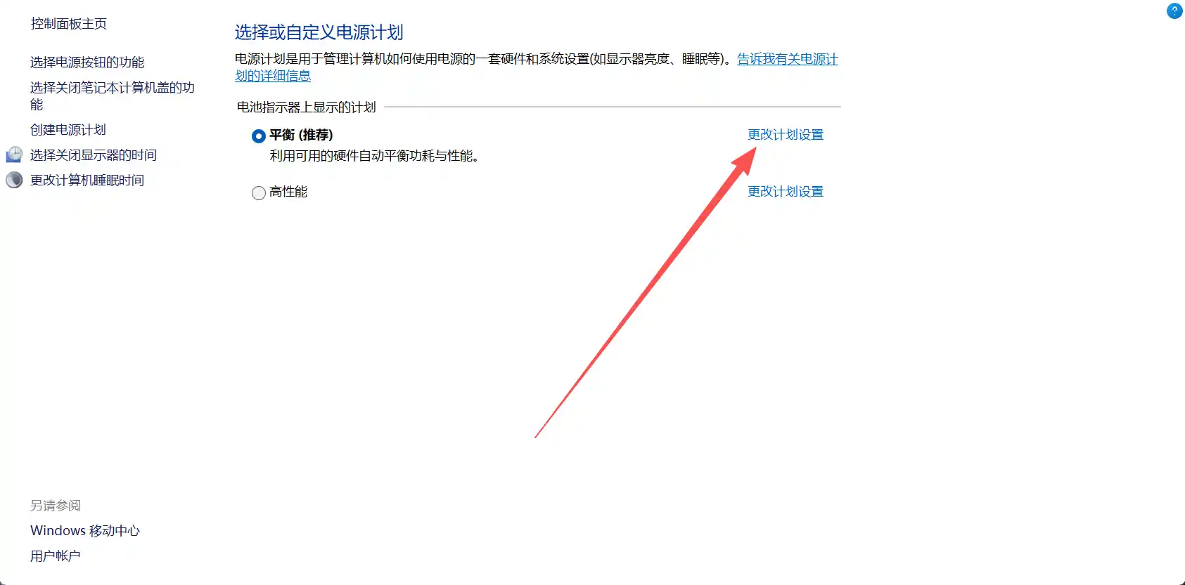 2.在控制面板依次选择硬件和声音>电源选项>更改计划设置>更改高级电源设置,如下图。