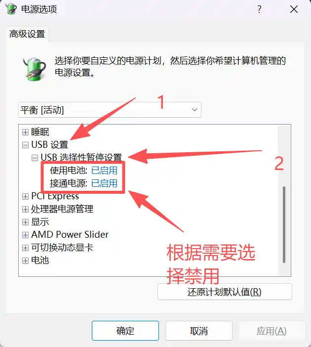 3.在打开的窗口中依次选择USB设置>USB选择性暂停设置,根据需要选择性禁用,如下图。