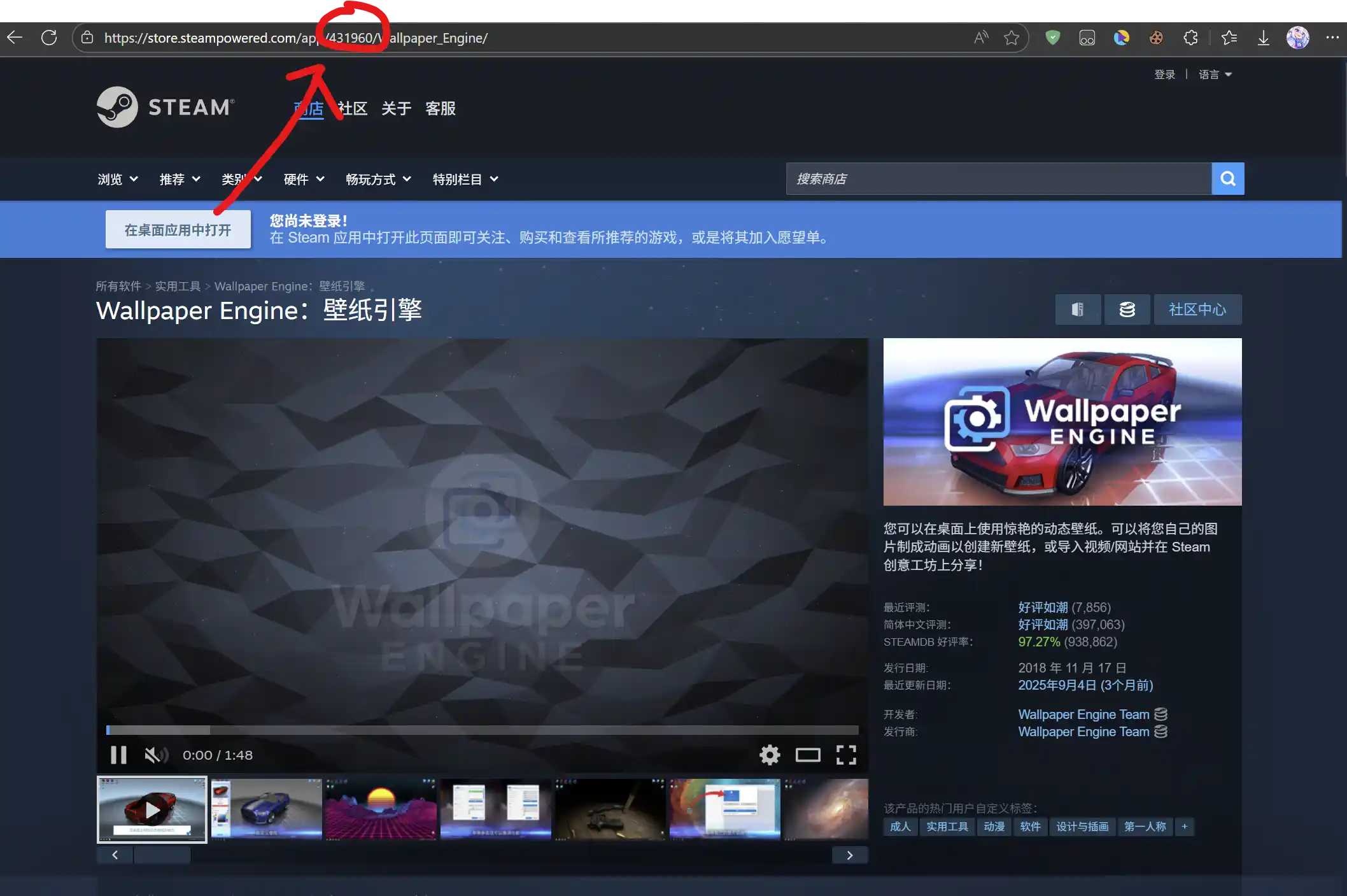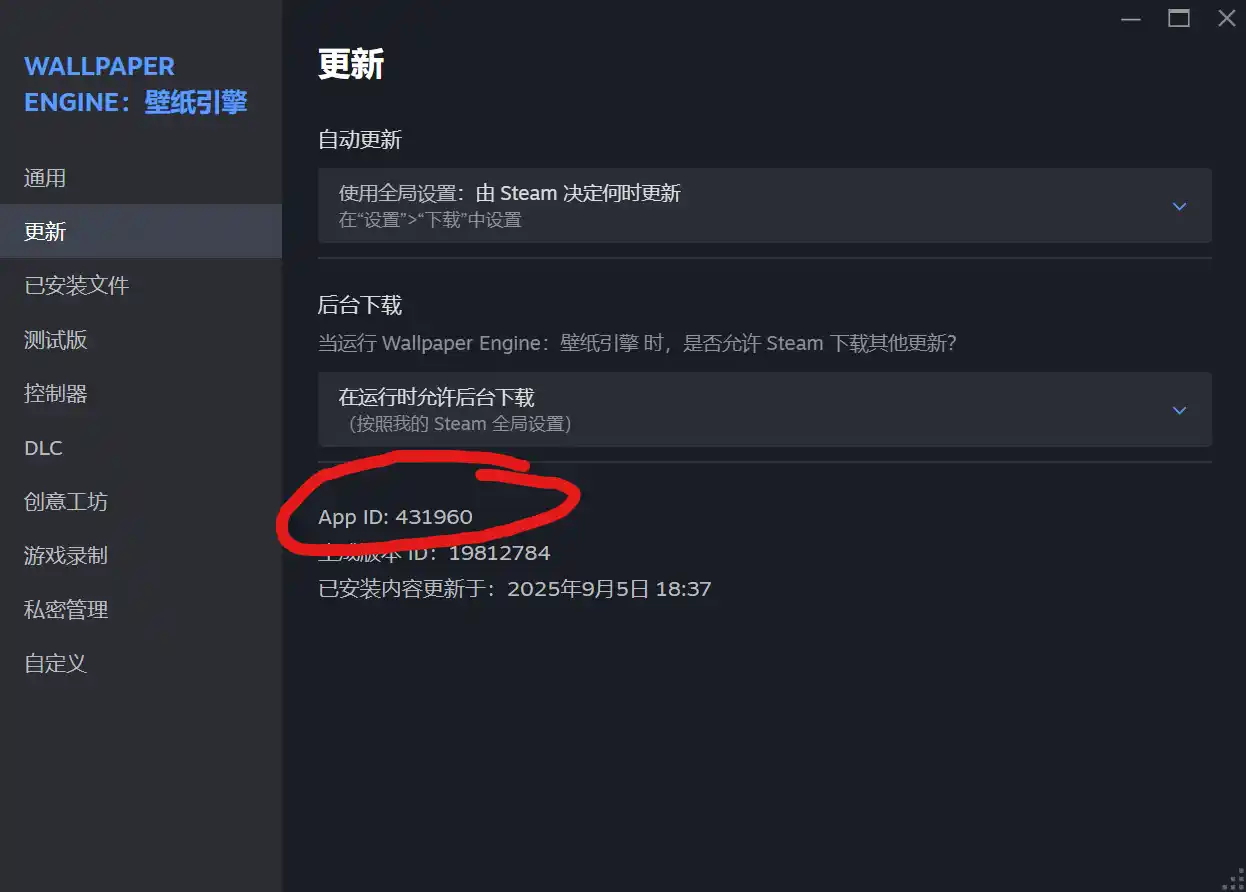 例如Wallpaper Engine:壁纸引擎的App ID为431960