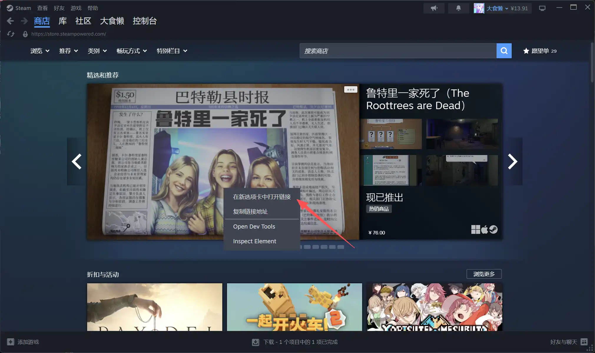 1.打开你的steam客户端到商店页面。右键任意一款游戏,选择在新选项卡中打开链接